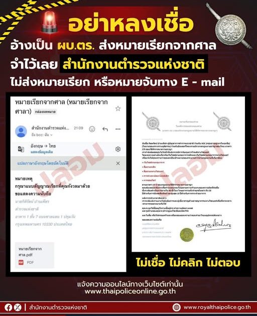 ข่าวประชาสัมพันธ์ 2 พฤษภาคม 2568 โดย admsobmoei_sm / ข่าวประชาสัมพันธ์,ข่าวฝากประชาสัมพันธ์ อย่าหลงเชื่อ อ้างเป็น ผบ.ตร. ส่งหมายเรียกจากศาล จำไว้เลย สำนักงานตำรวจแห่งชาติ ไม่ส่งหมายเรียก หรือหมายจับ ทาง E – mail ไม่เชื่อ ไม่คลิก ไม่ตอบ แจ้งความออนไลน์ ทางเว็บไซต์เท่านั้น www.thaipoliceonline.com #เตือนภัยออนไลน์ #สำนักงานตำรวจแห่งชาติ #Royalthaipolice Facebook iconFacebookTwitter iconTwitterLINE iconLine