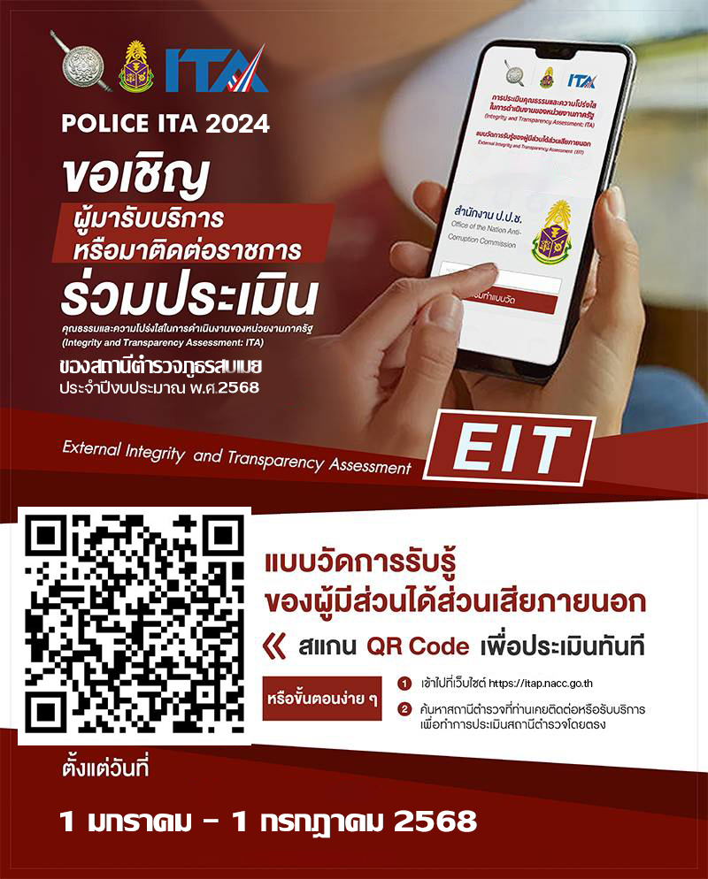 3. แบบวัดการรับรู้ของผู้มีส่วนได้ส่วนเสียภายนอก (External Integrity and Transparency Assessment: EIT) - ให้ สถานีตำรวจนำช่องทางการเปิดเผยข้อมูลสาธารณะ ((IT) เปิดเผย ณ จุดให้บริการ และพัฒนา การให้บริการเพื่อสร้าง ความรวดเร็วและความสะดวกให้แก่ประชาชน ก่อนทำการประเมินแบบวัดการรับรู้